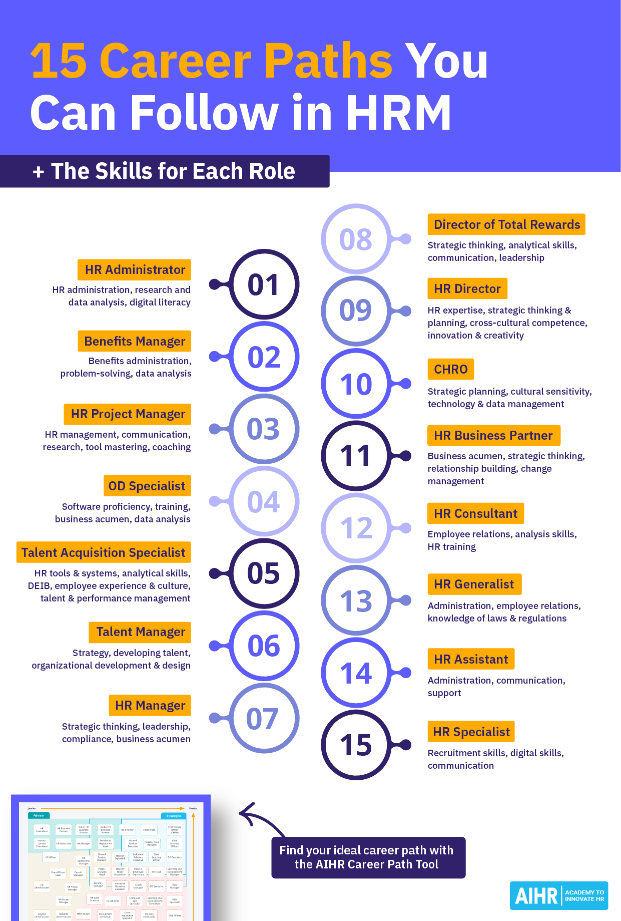 This cheat sheet outlines 15 distinct career paths within HR, along with the skills required for each role. It’s an essential resource for HR professionals looking to explore opportunities, specialize, and advance their careers in the field of human resources.