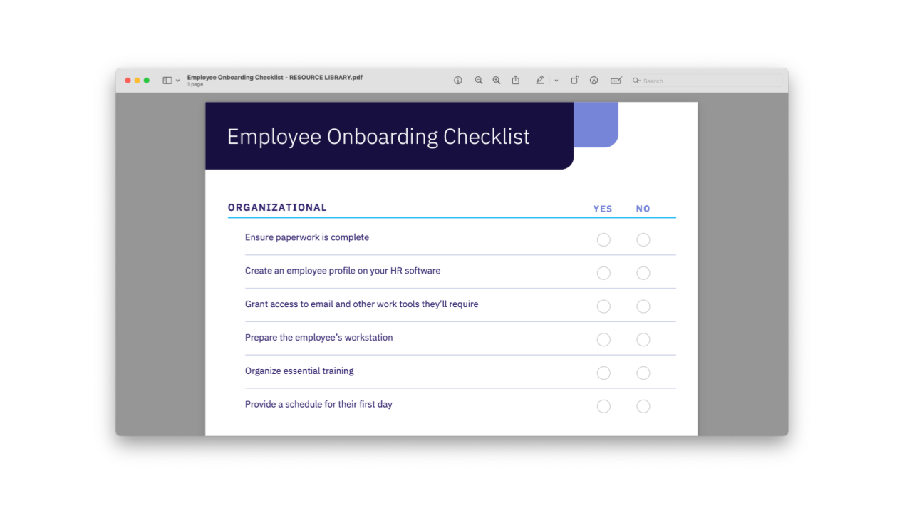 Ensure that your new hires are off to a great start with this simple 1-page employee onboarding checklist.